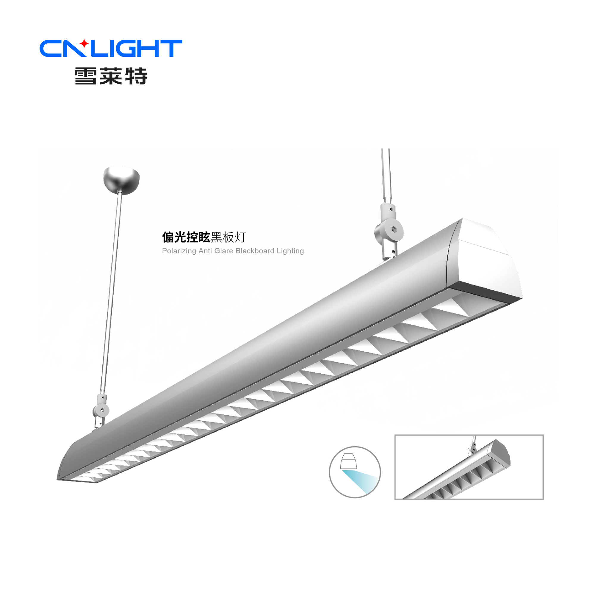 侧向防眩,偏光式黑板灯,偏光透镜加防眩格栅,先生位置无显着眩光感,支持吸顶装置,吊绳装置,可调角度吊杆装置,高PF无频闪,高显指,非调光(可定制可控硅或0-10V或DALI调光)